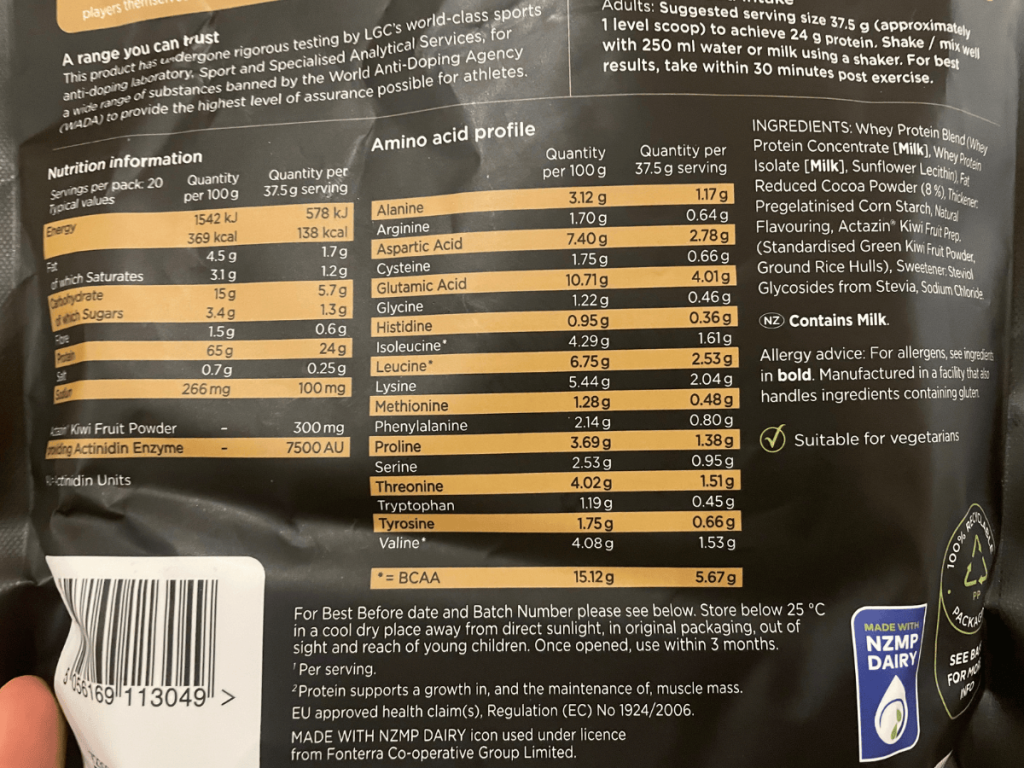 A very solid macro panel, especially when you consider the slightly larger 37.5g scoop size. Everything’s well balanced and in line with what I’d expect from a premium whey blend.