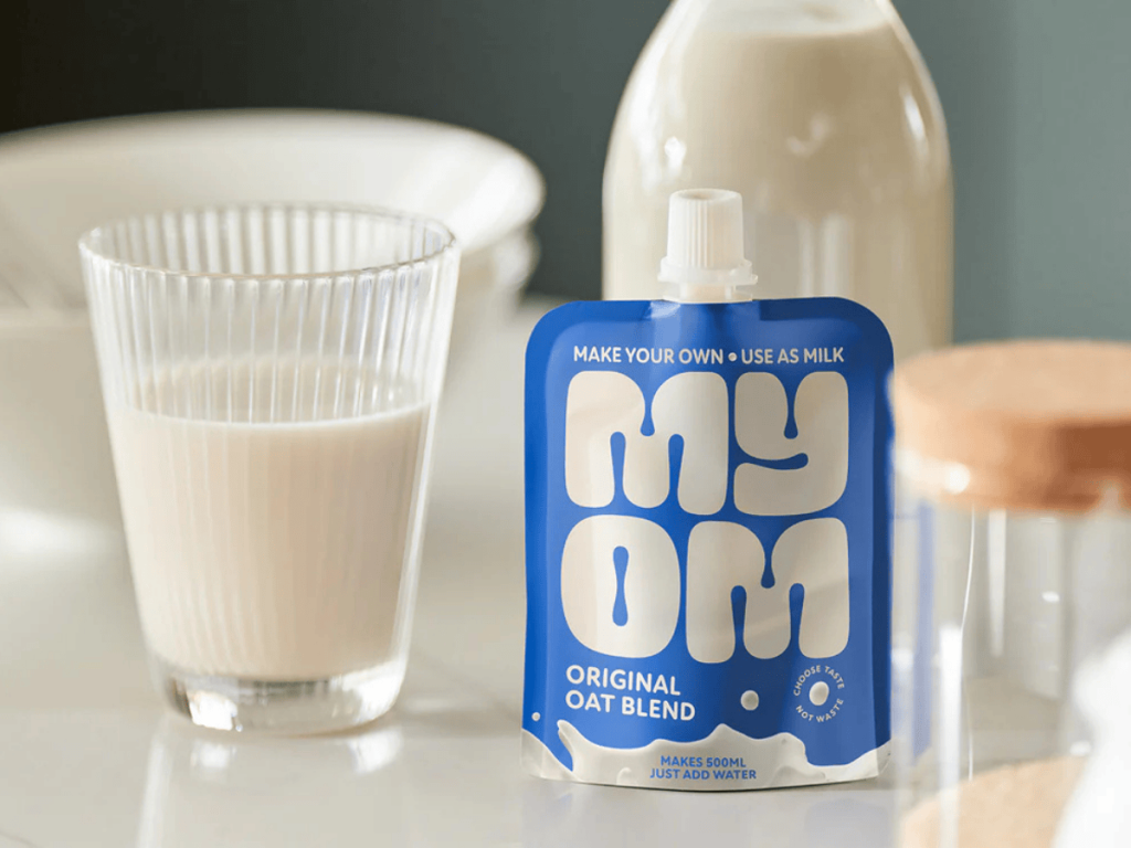 Unlike most ready to drink cartons, MYOM comes in handy liquid sachets that mix with water to create zero-waste oat milk on demand.