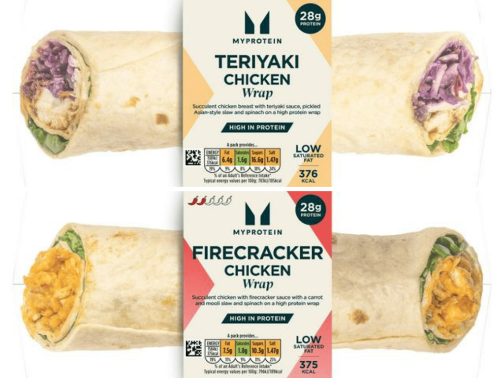 Two Myprotein wraps — Firecracker Chicken and Teriyaki Chicken — spearhead the range. They’ll be joined by a Greek Chicken Salad, delivering up to 28g of protein for fewer than 376 calories.