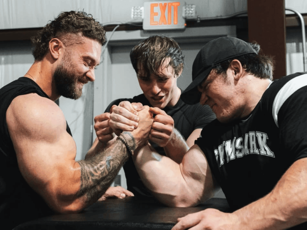 The video then cut to a training montage of the trio smashing a huge back day and finishing with a few sets of arm wrestling.